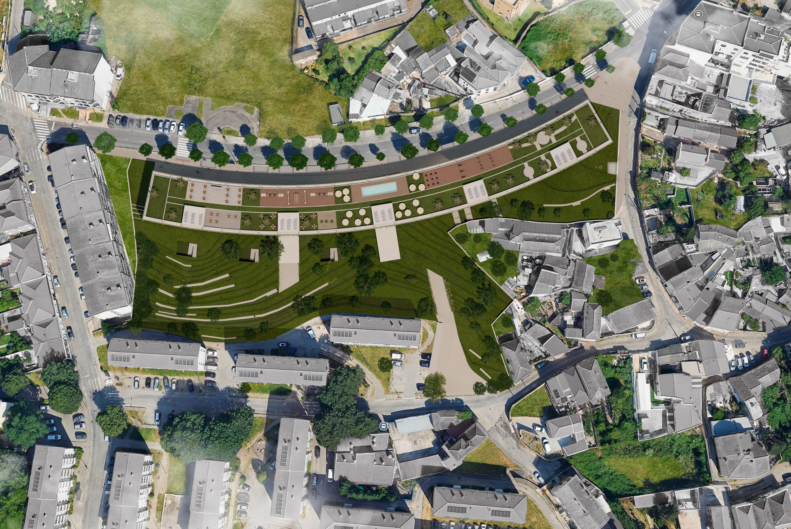 No tardoz, concebemos um grande pulmão urbano, pensado para aliviar e equilibrar uma cidade densificada. Aproveitámos o desnível natural do terreno para criar taludes suaves, evocando discretamente as vinhas do Douro, mas numa escala humana, habitável e integrada.