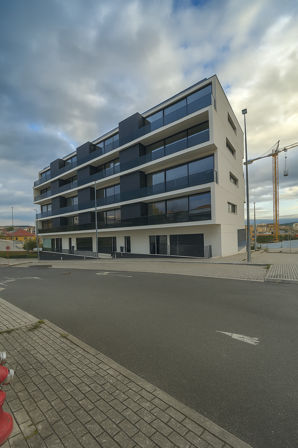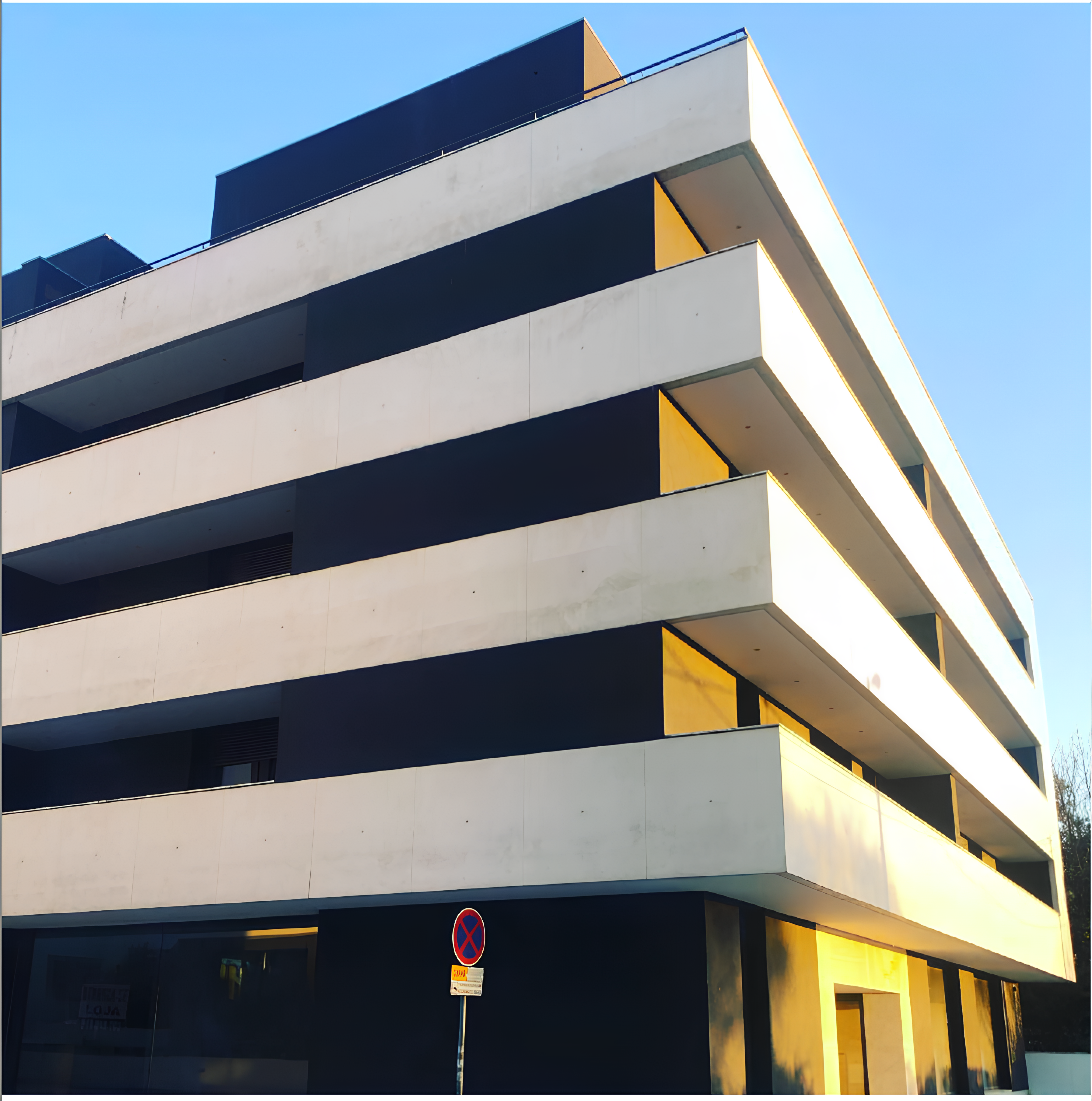 Em Bragança, desenvolvemos dois projetos particularmente marcantes, e o primeiro, pela sua escala e presença urbana, merece destaque. O primeiro é um edifício de grande dimensão, marcado pelo conceito volumétrico das caixas deslizantes, que gera cheios e vazios profundos e um contraste expressivo entre o branco das fachadas e a caixilharia escura. Optámos por duas entradas, reforçando funcionalidade e conforto. Tecnologicamente, reforçámos tudo: bomba de calor, piso radiante, isolamento térmico e, sobretudo, um cuidado acústico absoluto, porque Bragança tem algo único para oferecer ao mundo: o silêncio.